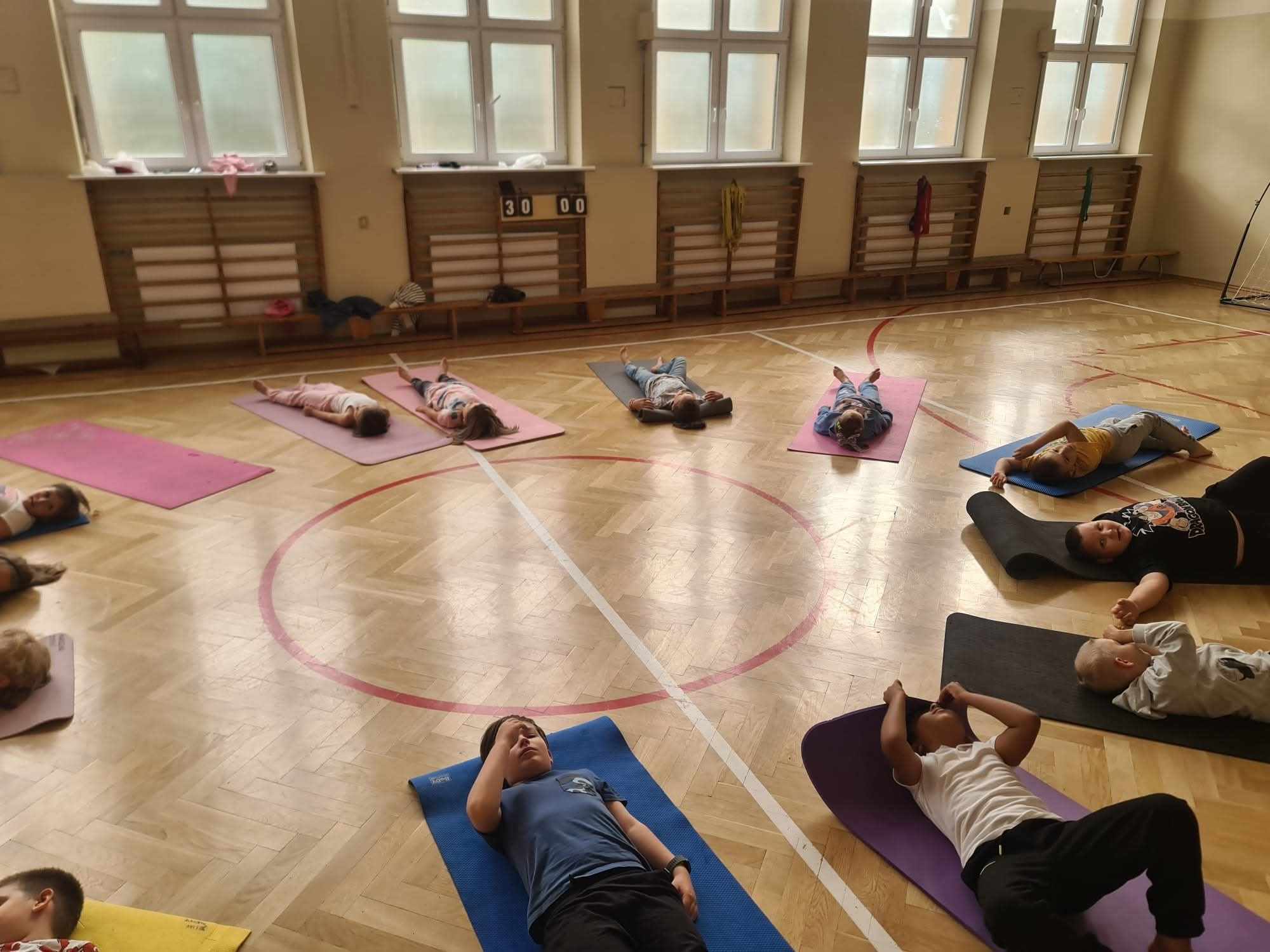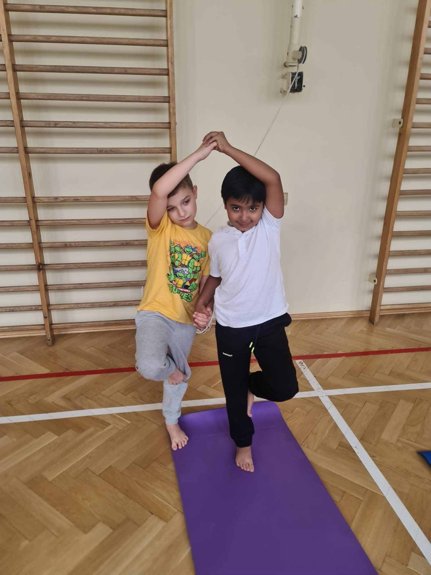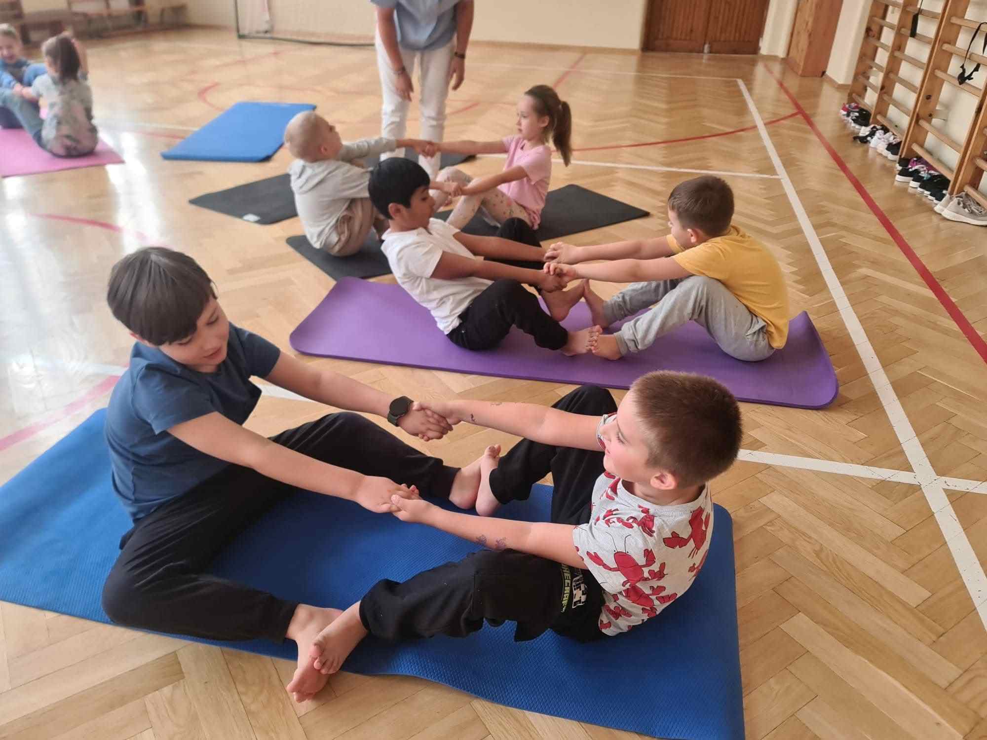 Pierwszaki z zapałem wykonują pozycje jogi: drzewo czy pies z głową w dół. Współpracują, masują, oddychają, medytują, kreują.