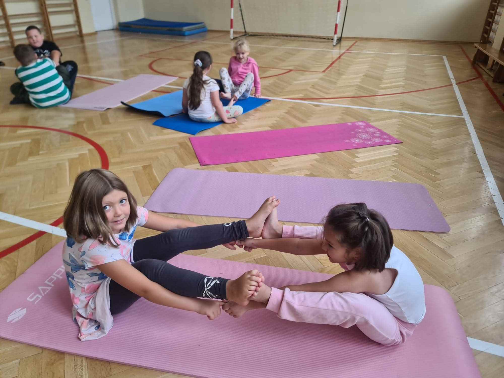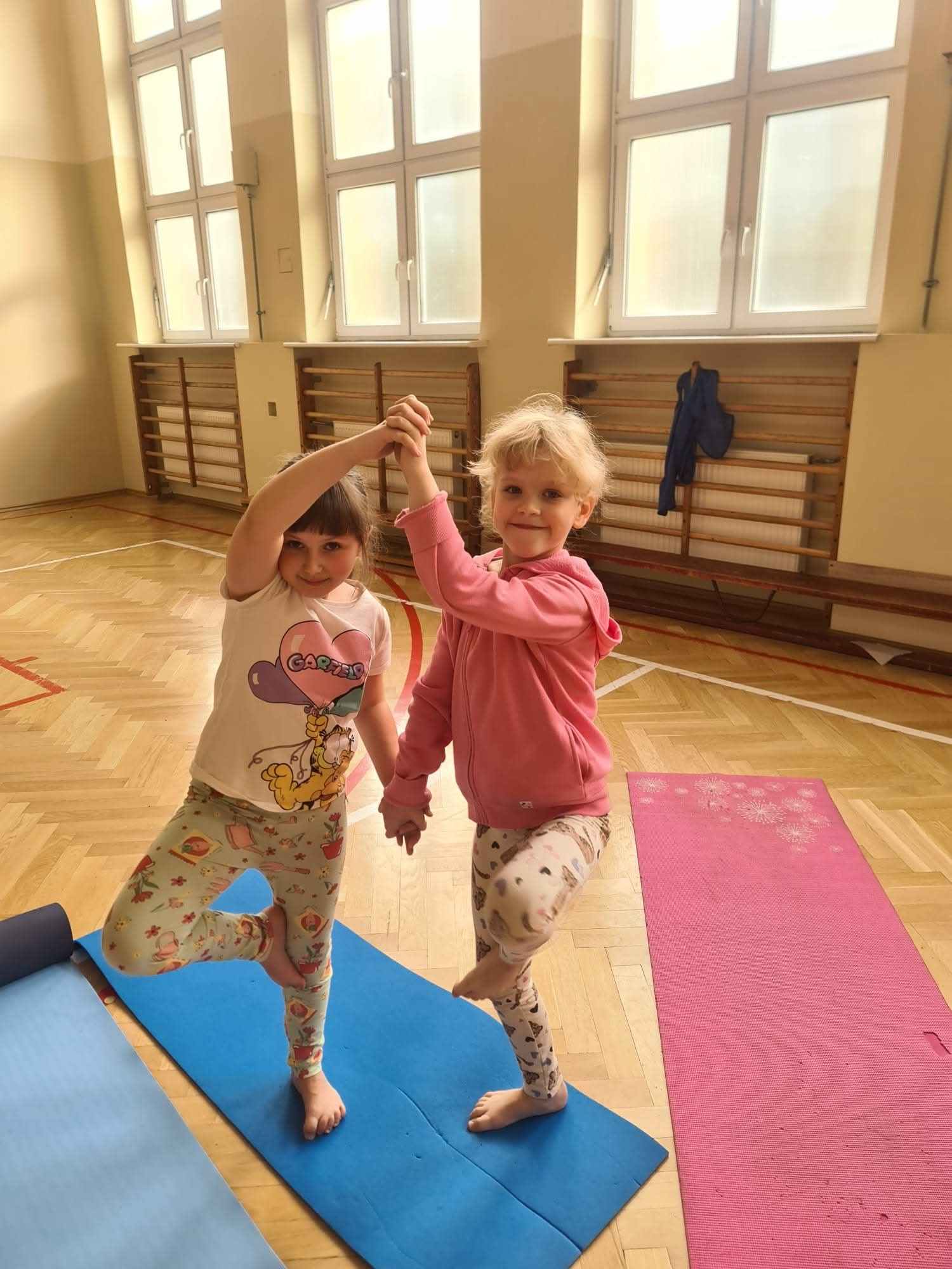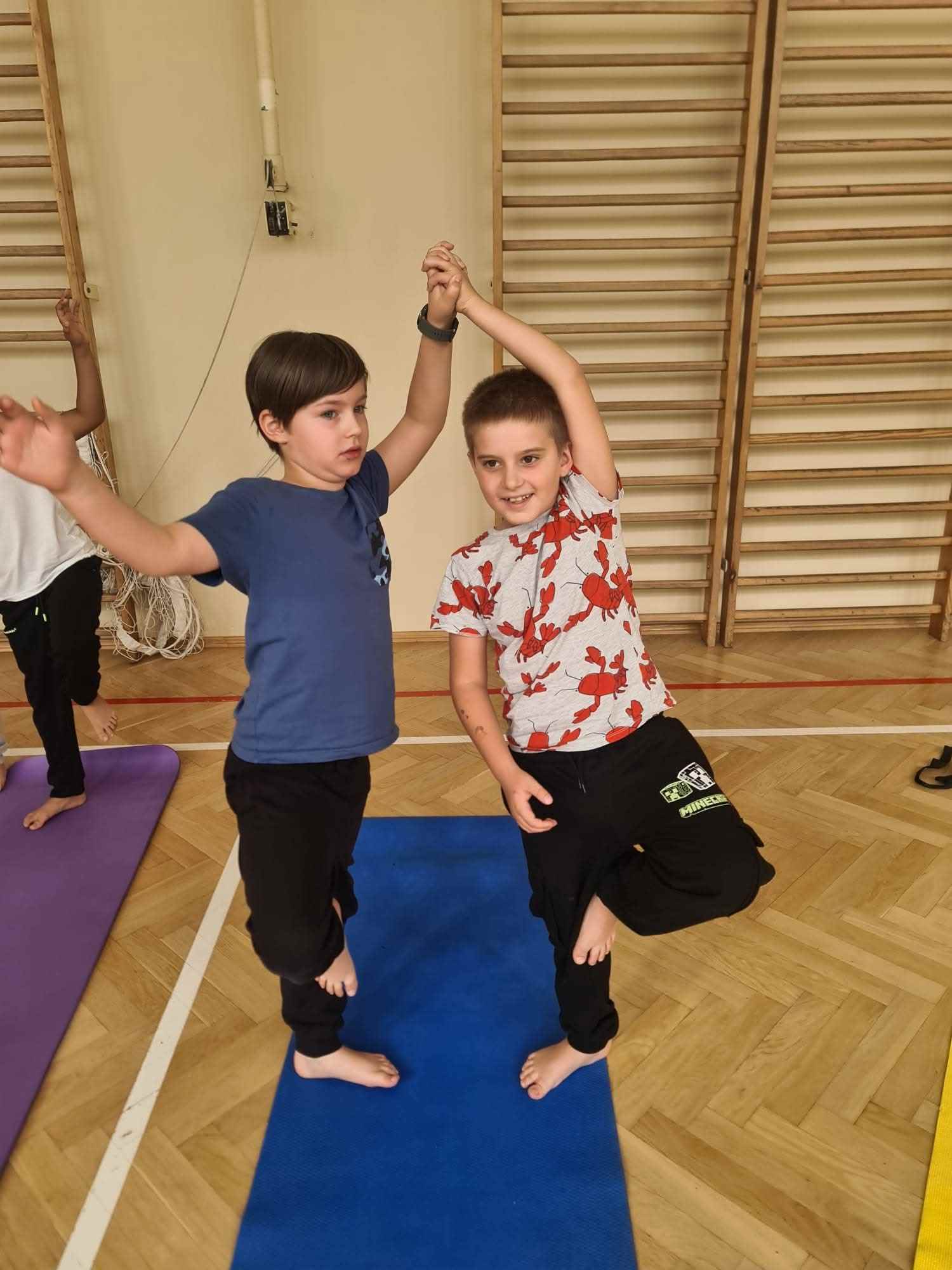 Pierwszaki z zapałem wykonują pozycje jogi: drzewo czy pies z głową w dół. Współpracują, masują, oddychają, medytują, kreują.