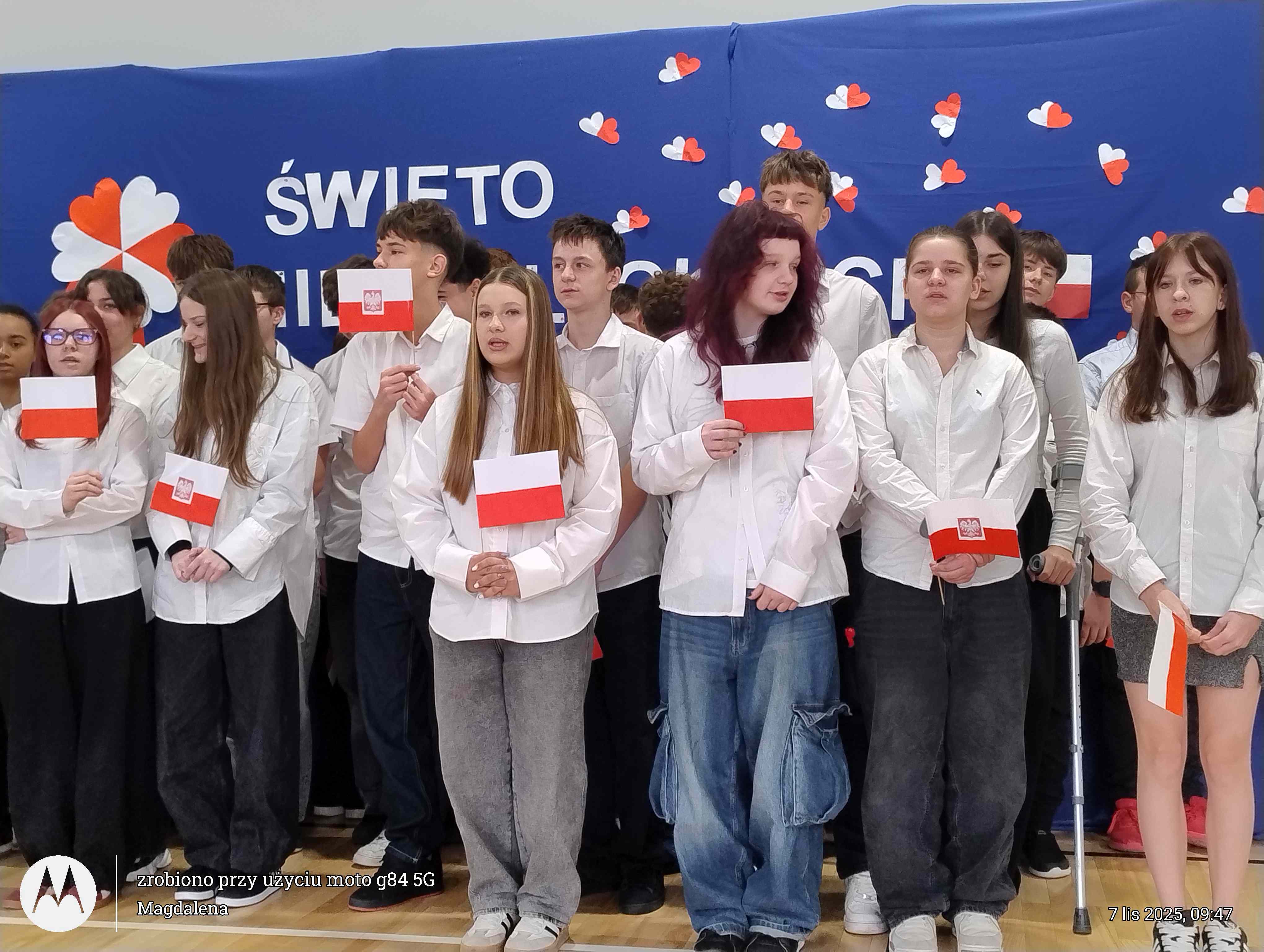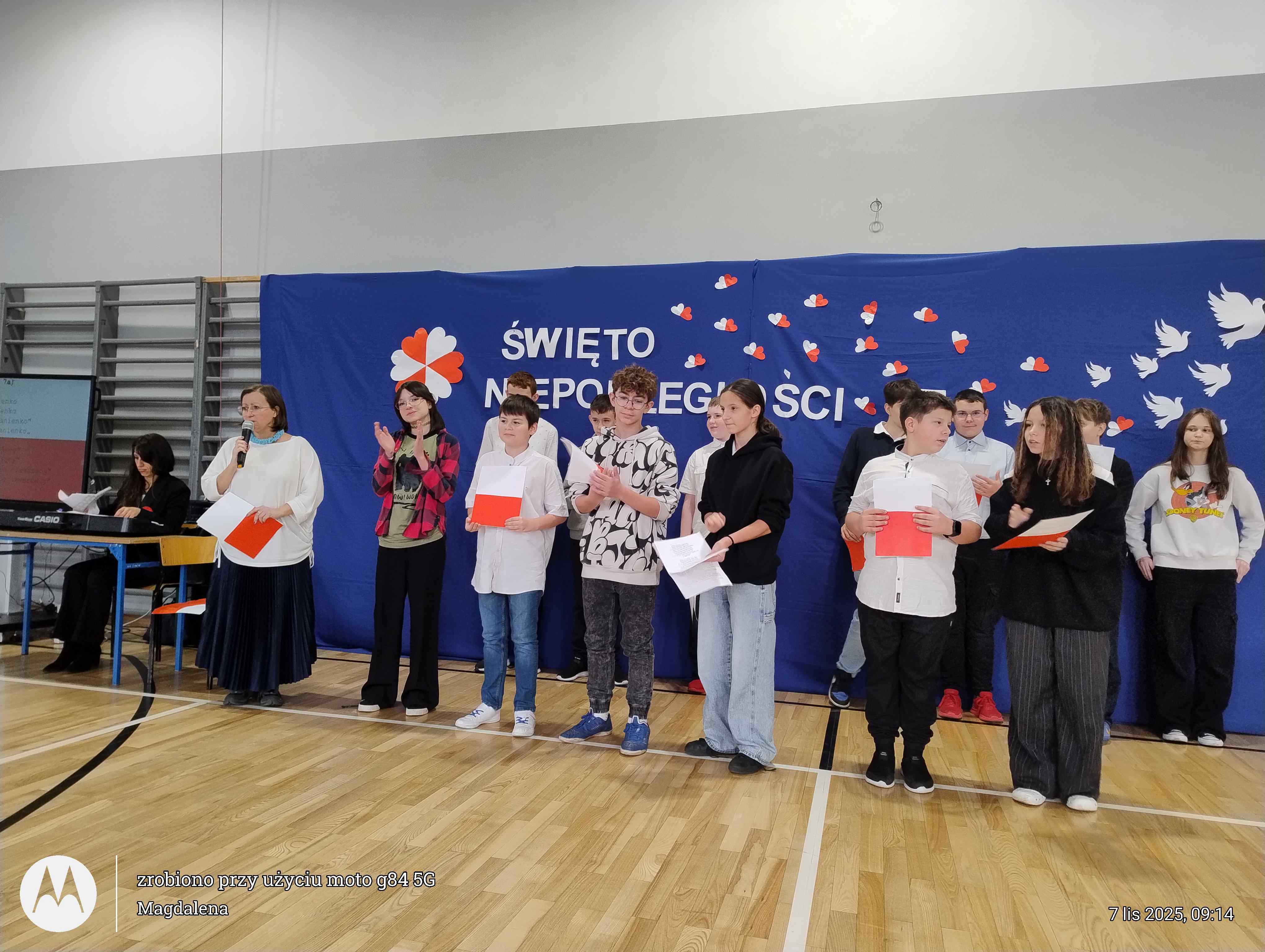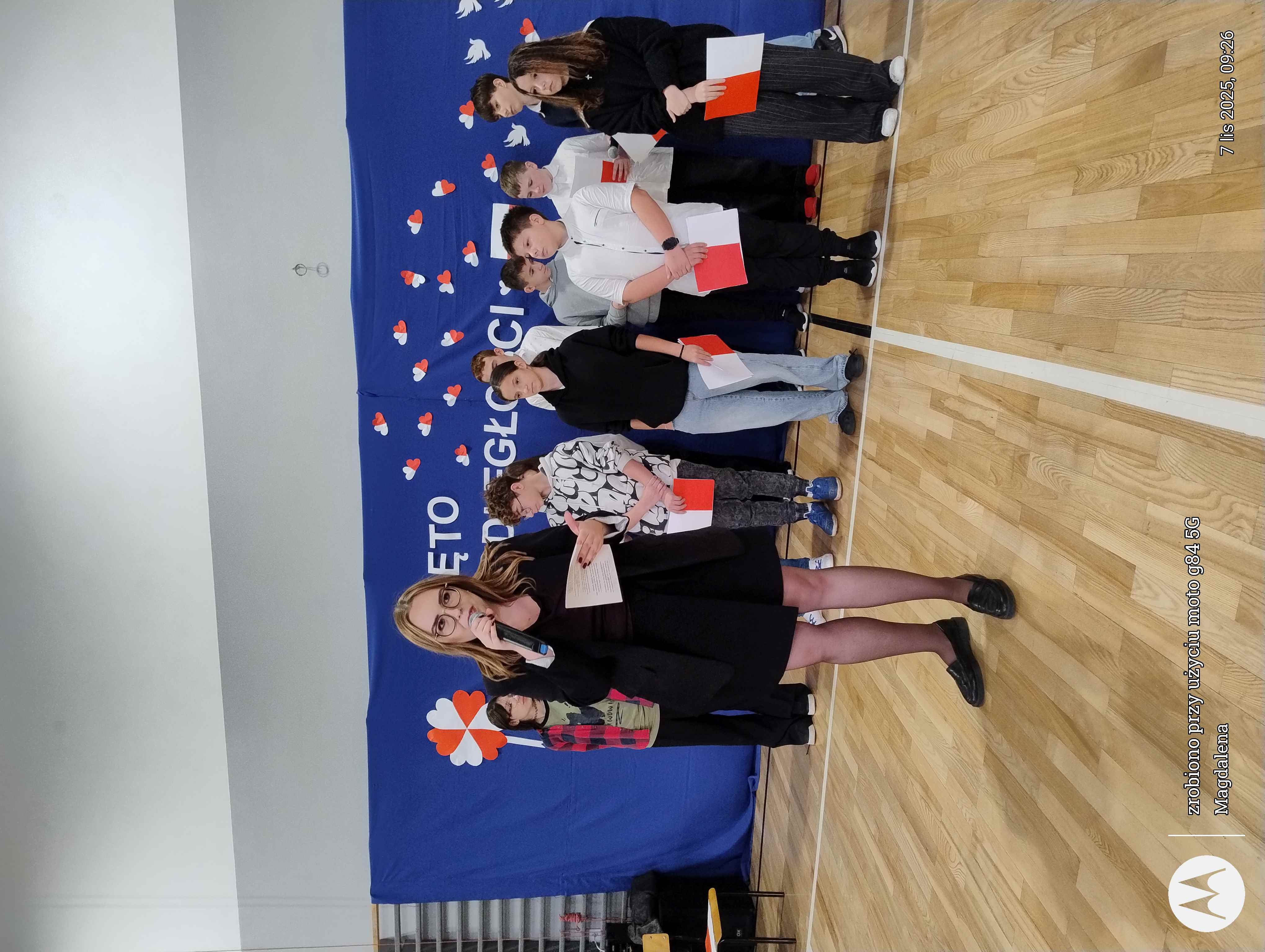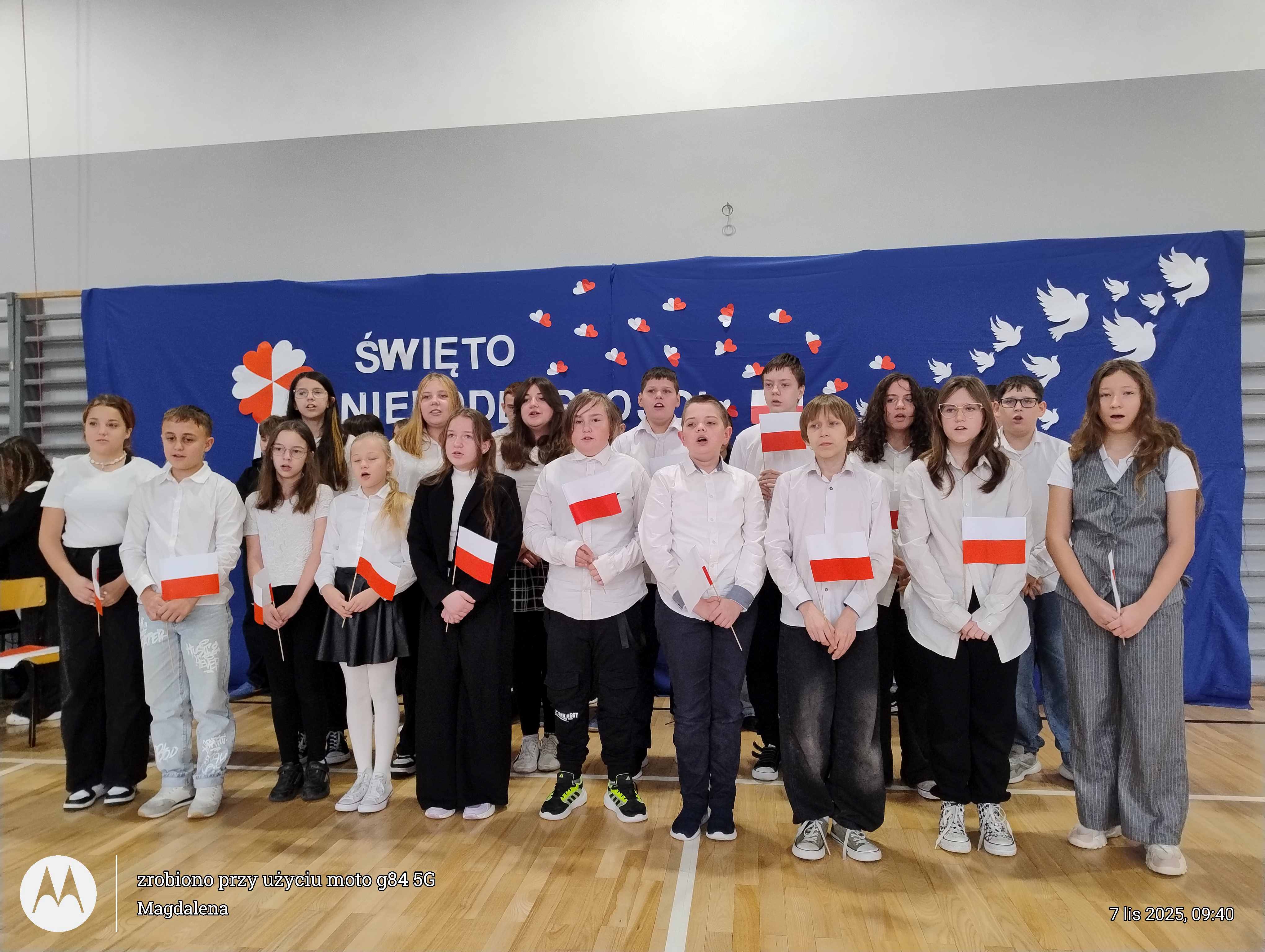 Wspólne odśpiewanie Mazurka Dąbrowskiego połączyło nas wszystkich uczniów, nauczycieli i gości – w jednym głosie dumy z bycia Polakami.