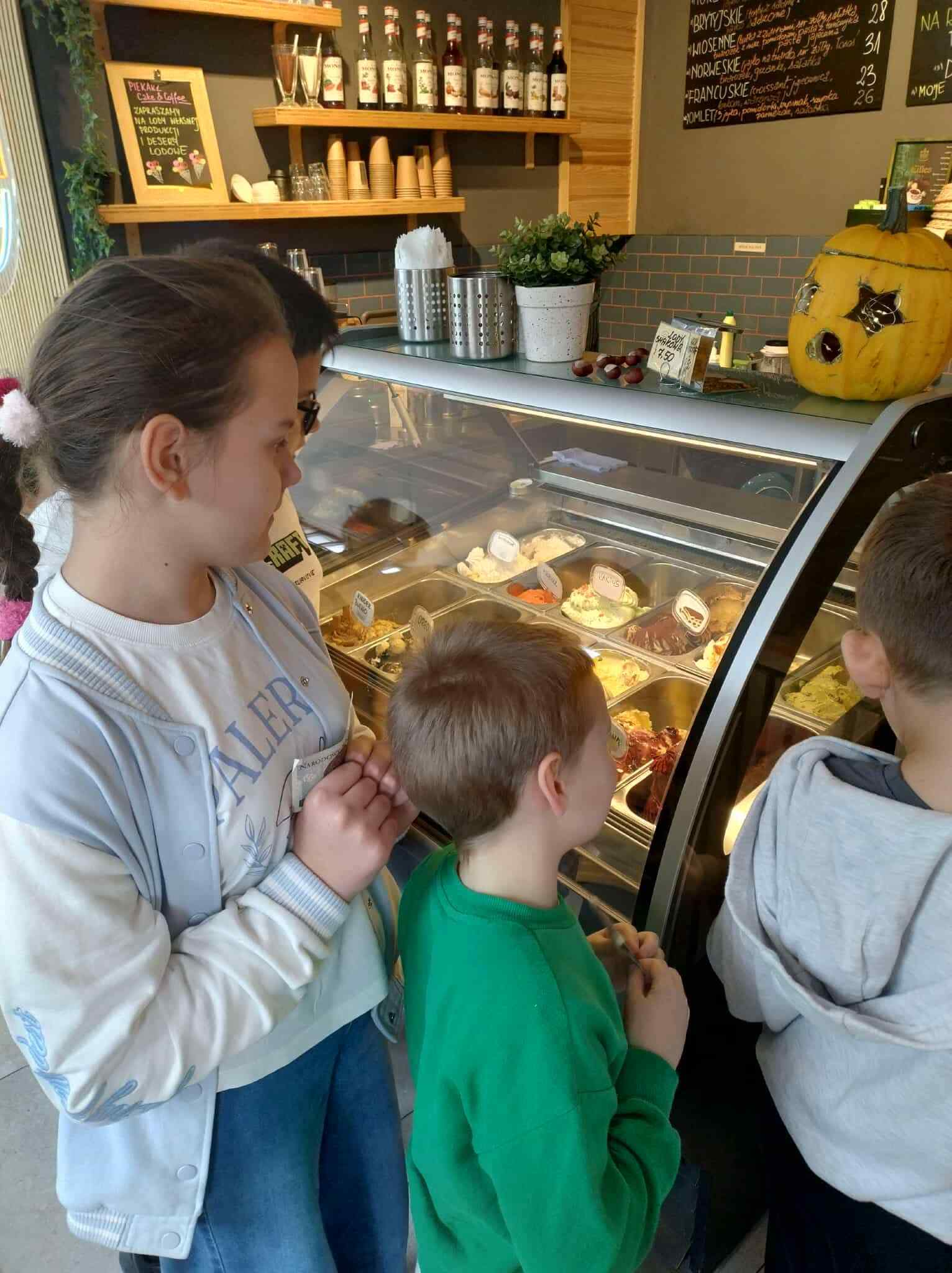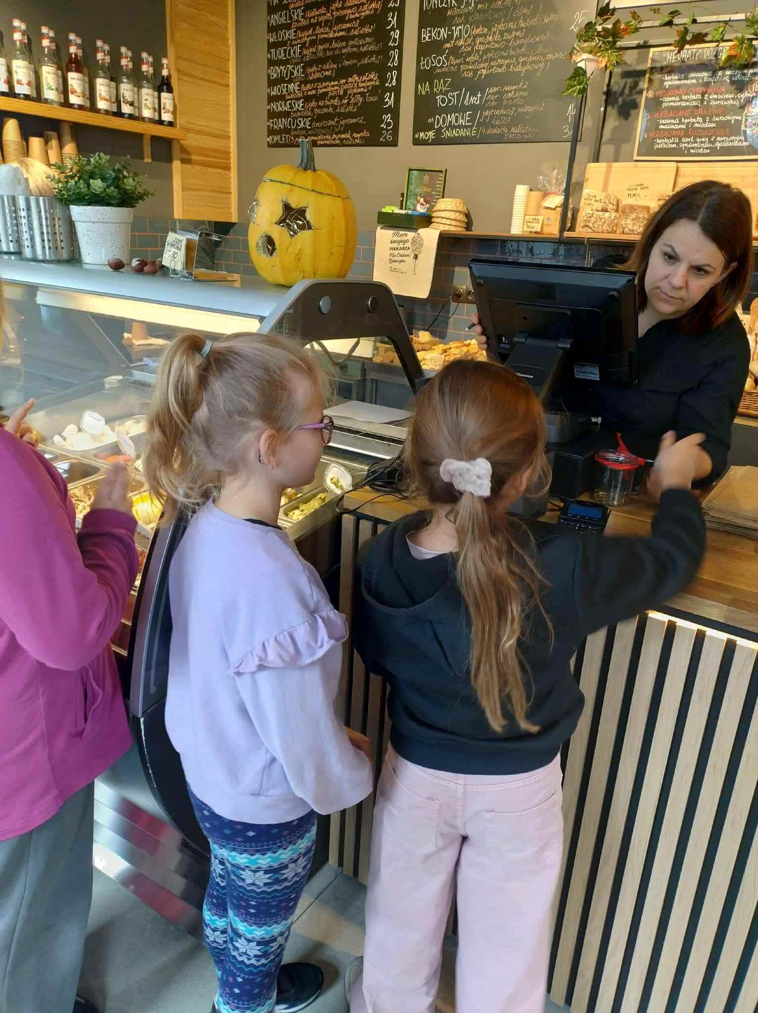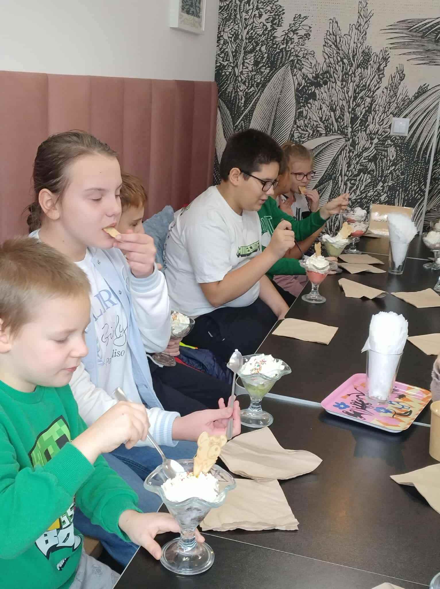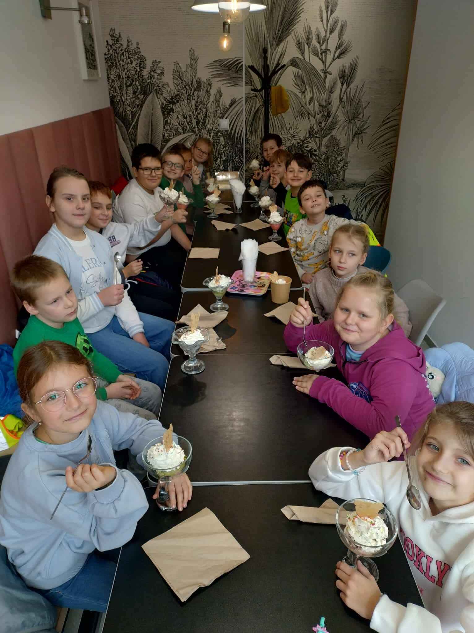 Dziś uczniowie klasy 2b wraz z nauczycielkami wybrali się na lody, by w radosnym nastroju uczcić Dzień Nauczyciela. Podczas pobytu w cukierni doskonalili obliczenia pieniężne, płacąc za swoje zamówienie. Lody, jak zawsze w cukierni „Piekarz” były przepyszne, o czym świadczą szczęśliwe buzie na zdjęciach.