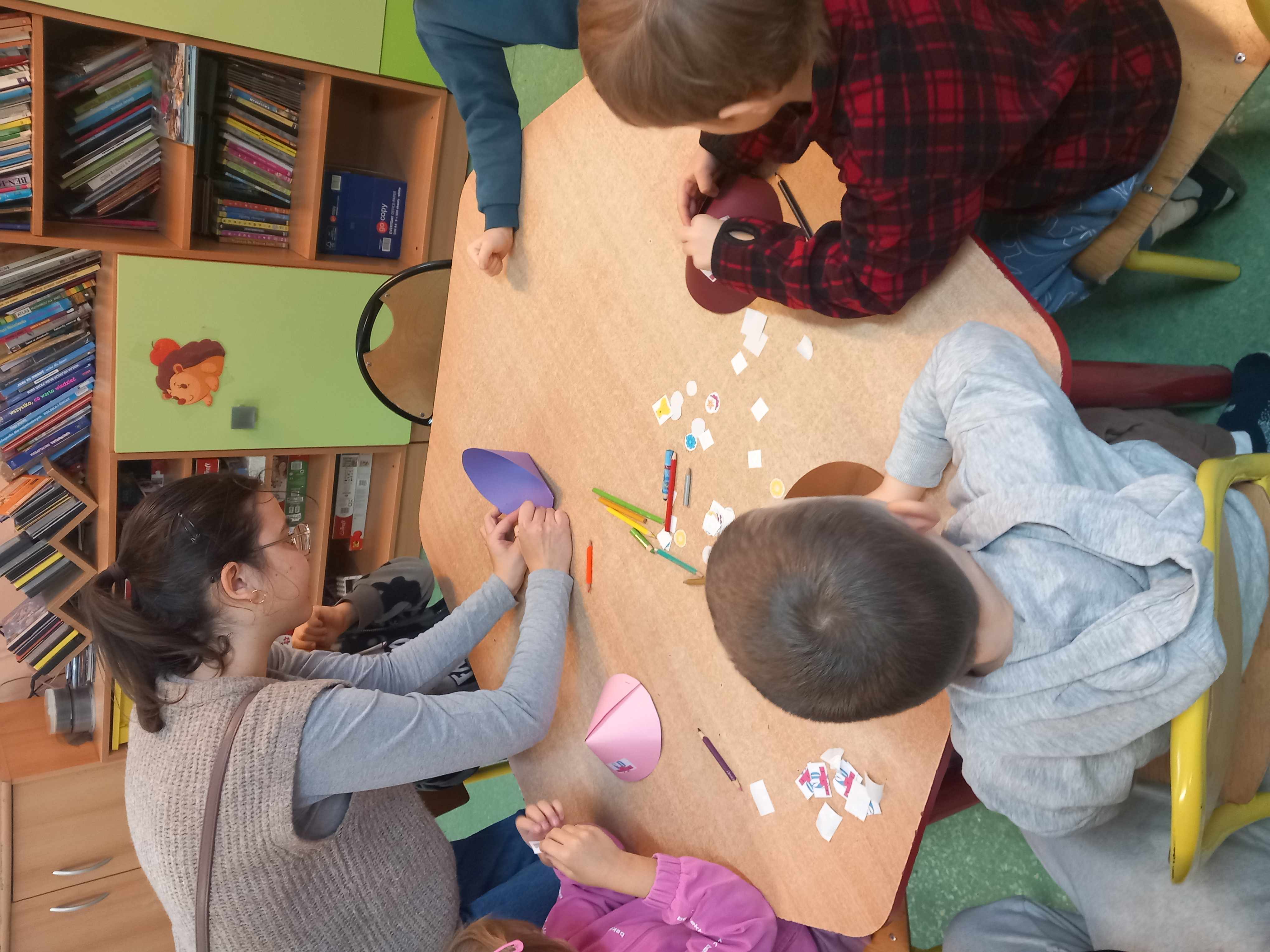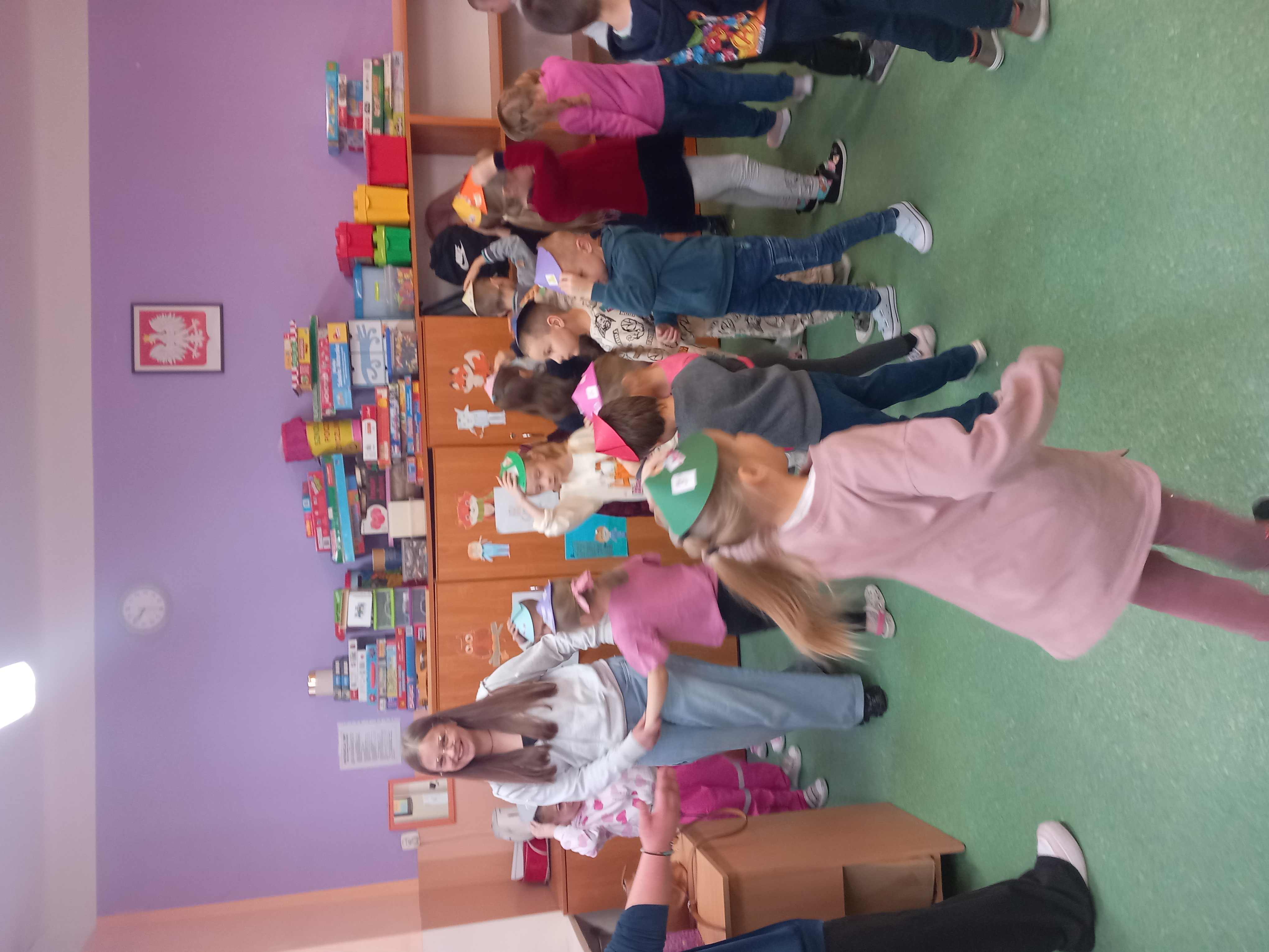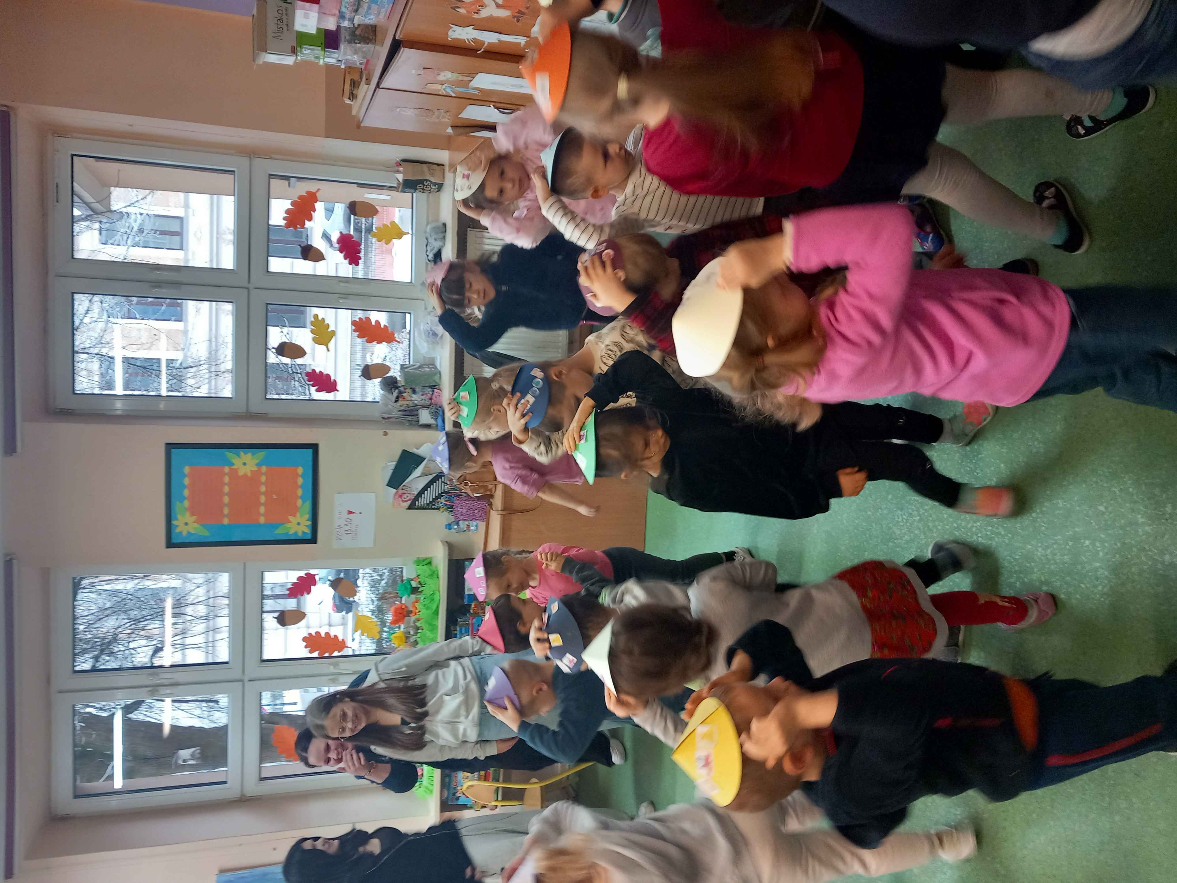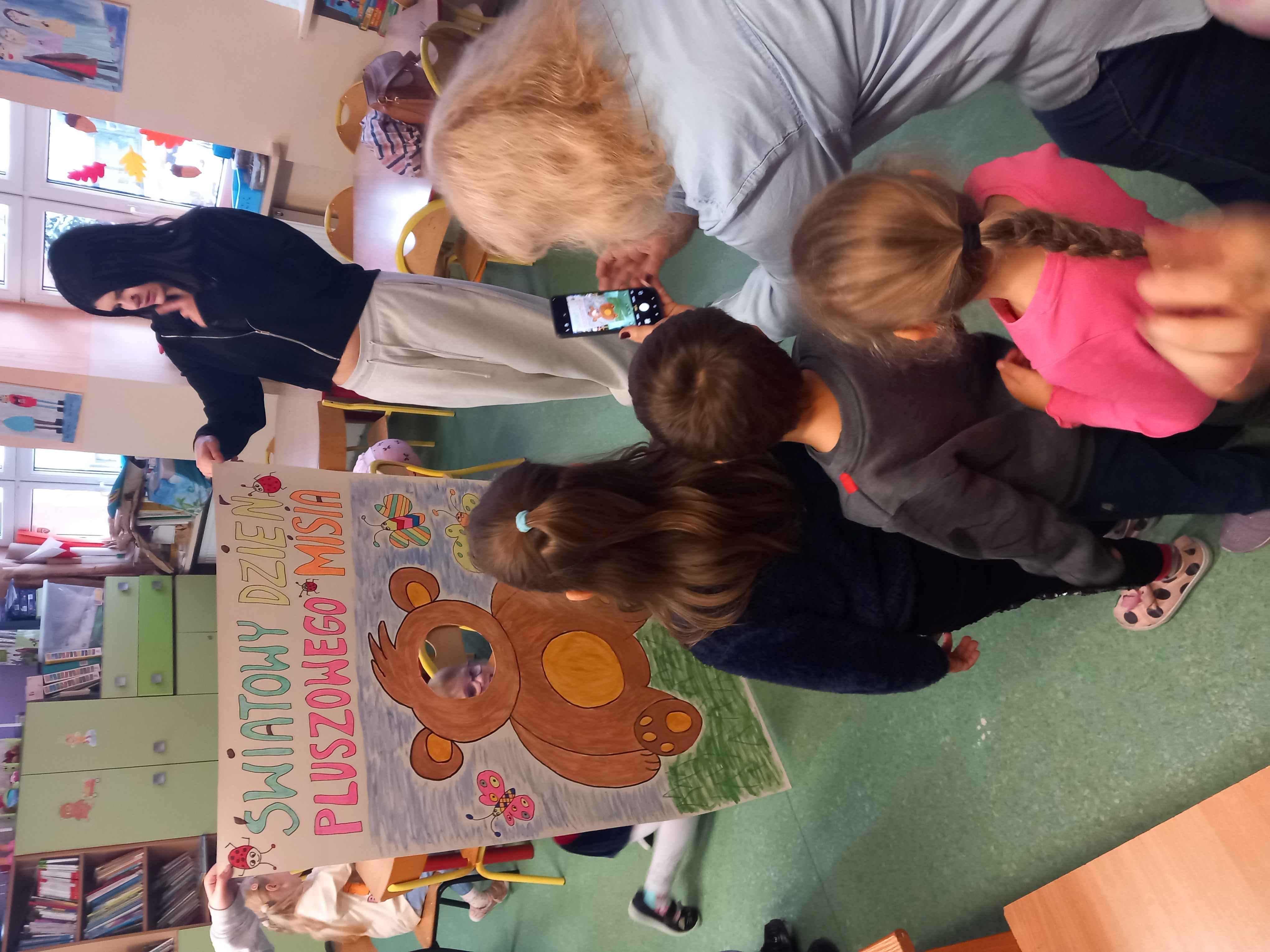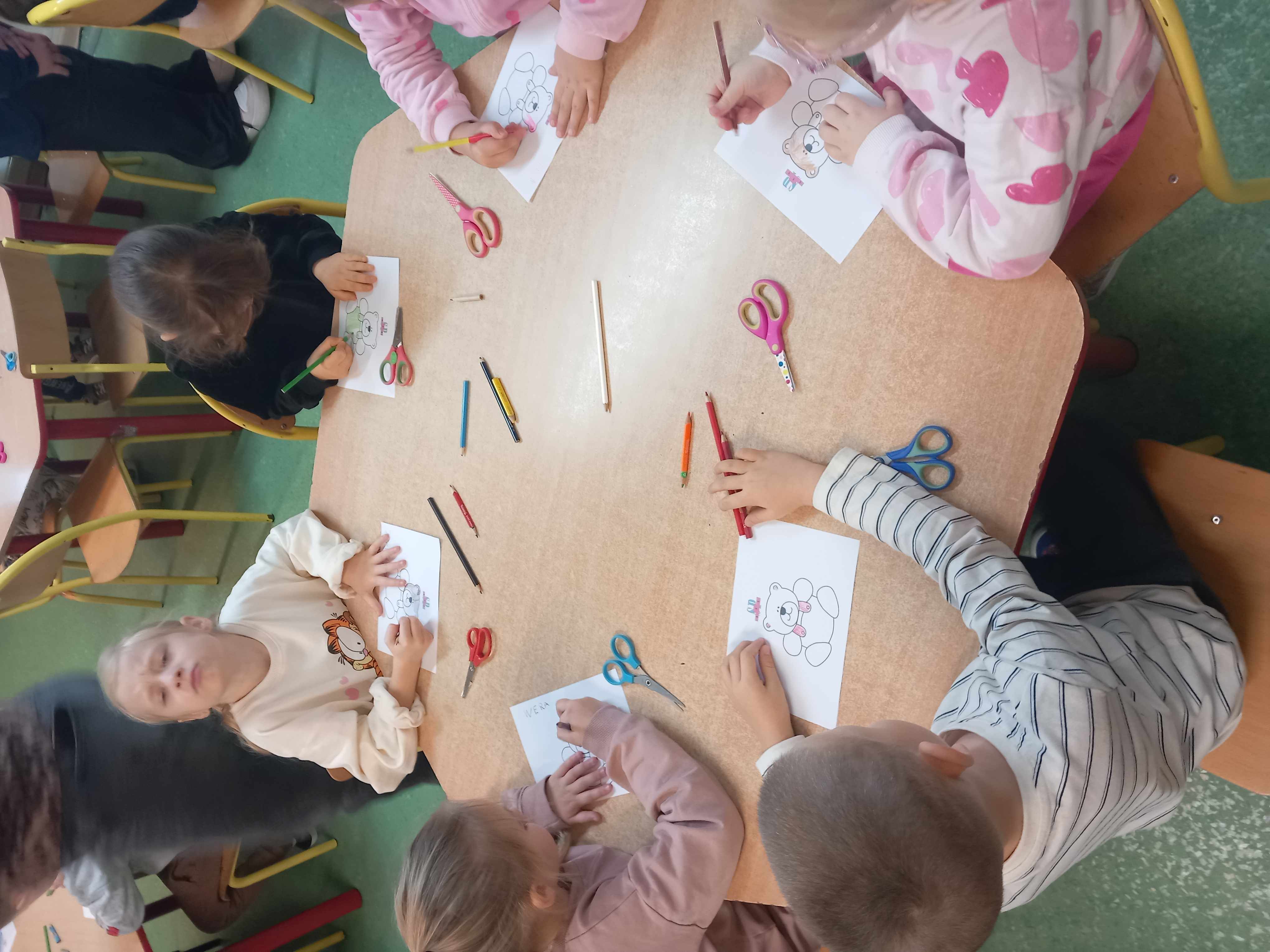 Dzieci uczestniczyły w zajęciach na temat miśków z okazji Światowego Dnia Pluszowego Misia: kolorowały wizerunek niedźwiadka, słuchały opowieści o nim, wykonały urodzinowe czapeczki na miśkowe przyjęcie. Po wspólnym wykonaniu urodzinowego tańca i zdjęciach w fotobudce, nasi goście zwiedzili szkołę, zajrzeli na lekcję klasy I a i zajęcia