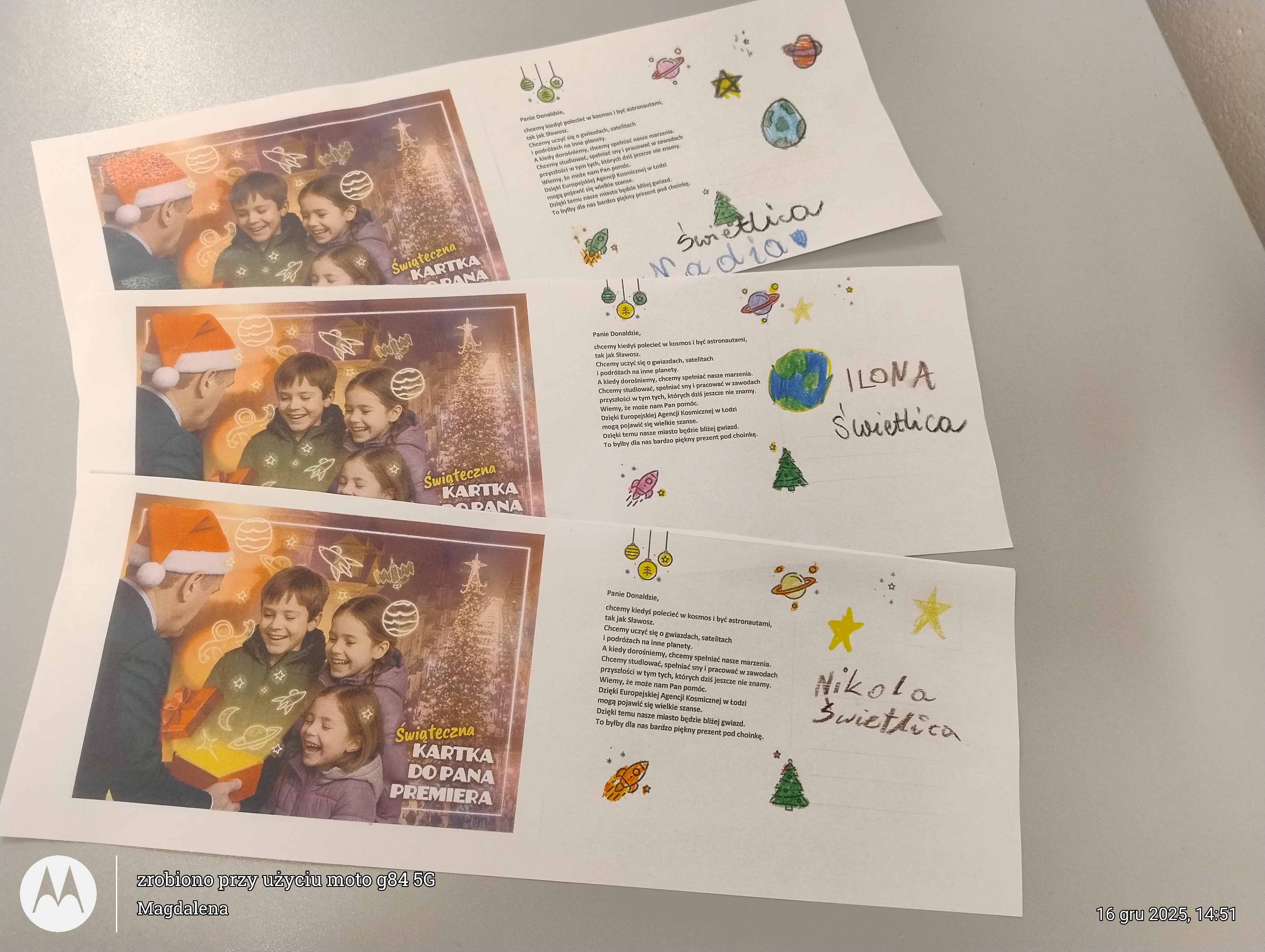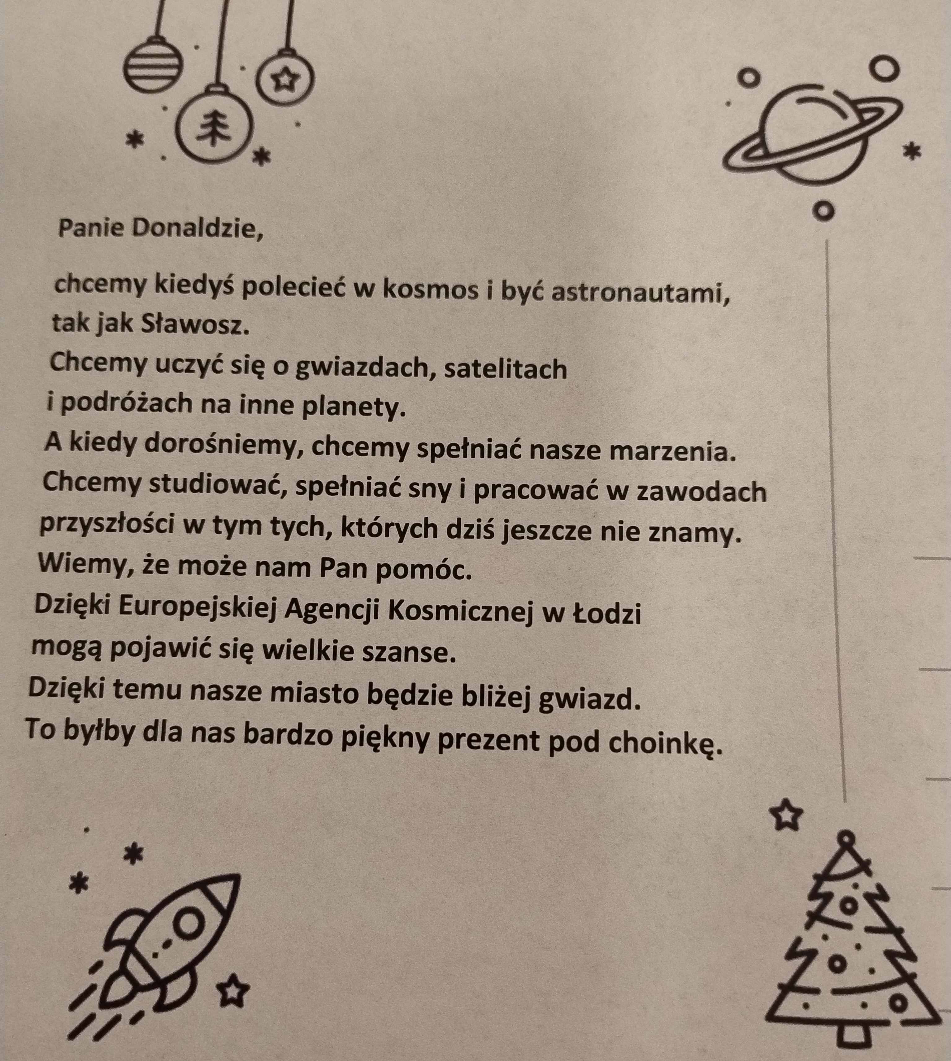 o gwiazdach, satelitach i podróżach na inne planety. A kiedy dorośniemy, chcemy spełniać nasze marzenia. Chcemy studiować, spełniać sny i pracować w zawodach przyszłości w tym tych, których dziś jeszcze nie znamy. Wiemy, że może nam Pan pomóc. Dzięki Europejskiej Agencji Kosmicznej w Łodzi mogą pojawić się wielkie szanse. Dzięki temu nasze miasto będzie bliżej gwiazd. To byłby dla nas bardzo piękny prezent pod choinkę.