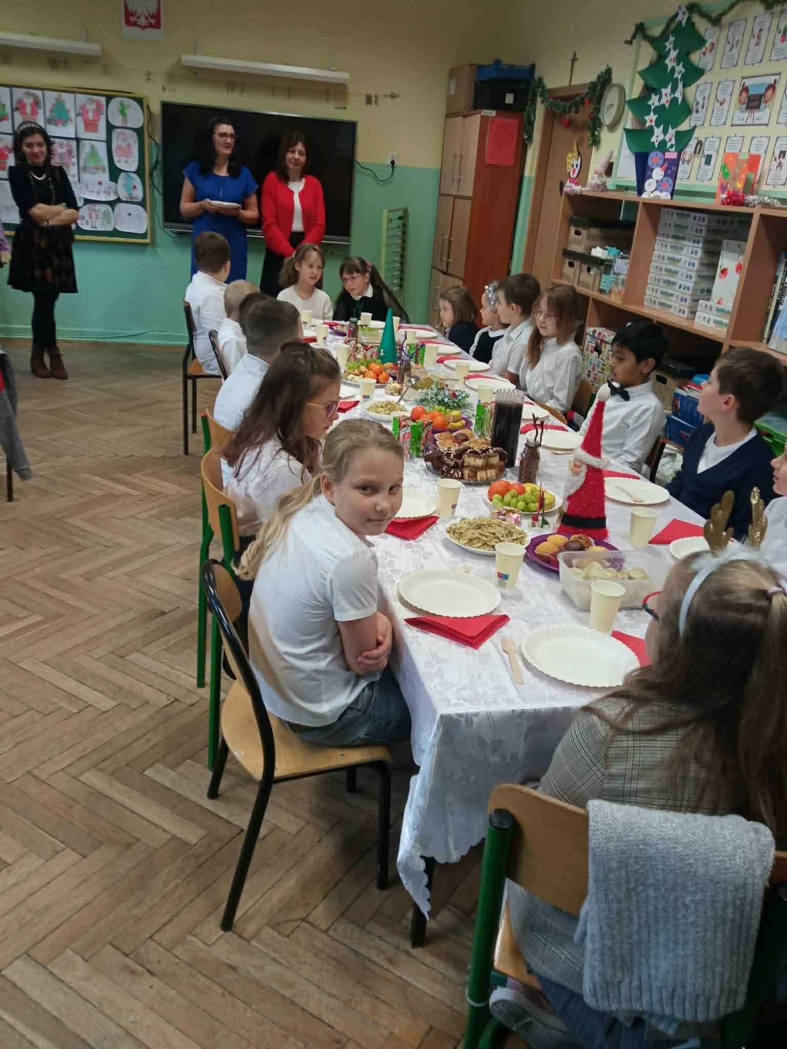 W klasie 1b odbyło się wyjątkowe spotkanie wigilijne, które wprowadziło wszystkich w radosny nastrój nadchodzących Świąt. W wydarzeniu wzięli udział uczniowie , ich rodzice oraz nauczycielki. Uroczystość uświetnił wspólny poczęstunek złożony z tradycyjnych potraw wigilijnych przygotowanych przez rodziców. Największą niespodzianką była wizyta Świętego Mikołaja , który obdarował każdego pierwszoklasistę upominkiem. Spotkanie przebiegło w ciepłej, rodzinnej atmosferze, pełnej życzeń i wspólnego świętowania.